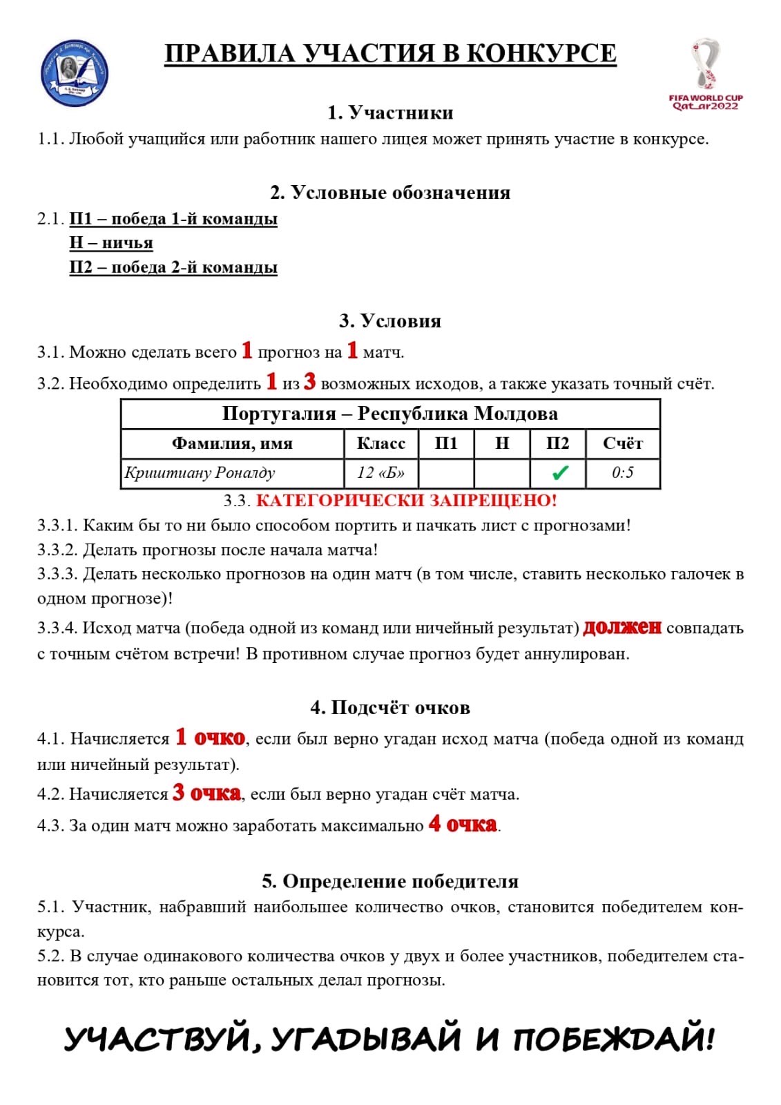 Всем! Всем! Всем! Внимание! В воскресенье начинается Чемпионат мира по футболу, за которым будут следить миллиарды людей по всему миру. В связи с этим событием методическая комиссия физического воспитания ТЛ имени Антиоха Кантемира проводит конкурс прогнозистов для учащихся и преподавателей, а также других работников нашего лицея. Цель конкурса – популяризация спорта и, как следствие, пропаганда здорового образа жизни. Не оставайтесь в стороне и принимайте участие! Прогнозы принимаются в спортивном зале лицея. За дополнительной информацией обращаться к Мажаровой Л.Е, Мажарову Ф.А.