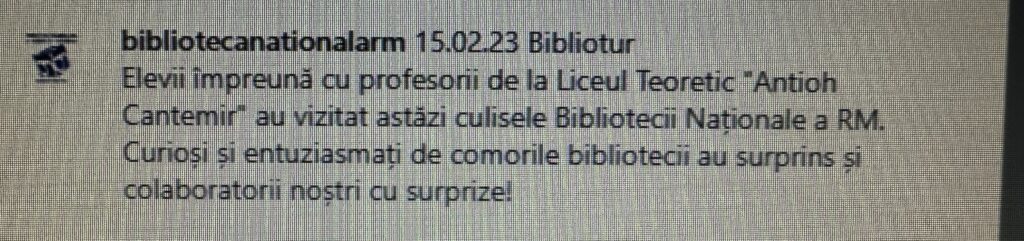 Вчера наши ученики 7Б и 7В класса совместно с Заместителем Директора, Доагэ Надеждой Кузьминичной, посетили Национальную Библиотеку Республики Молдова! Замечательная экскурсия, интересная беседа, приятные сюрпризы….и не только останутся в памяти наших учеников, а также представителей Библиотеки. Очень приятно было получить в конце экскурсии чудесный отзыв и отклик. ❤️