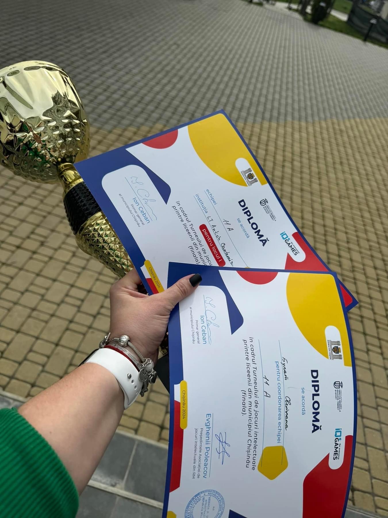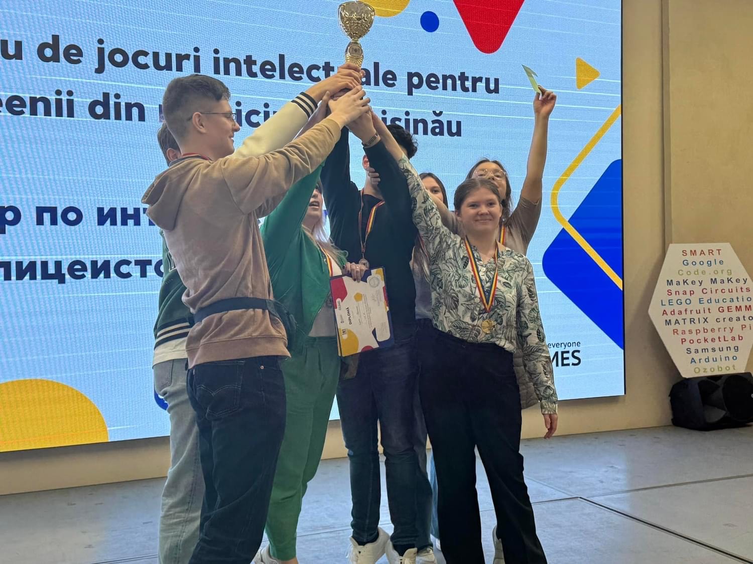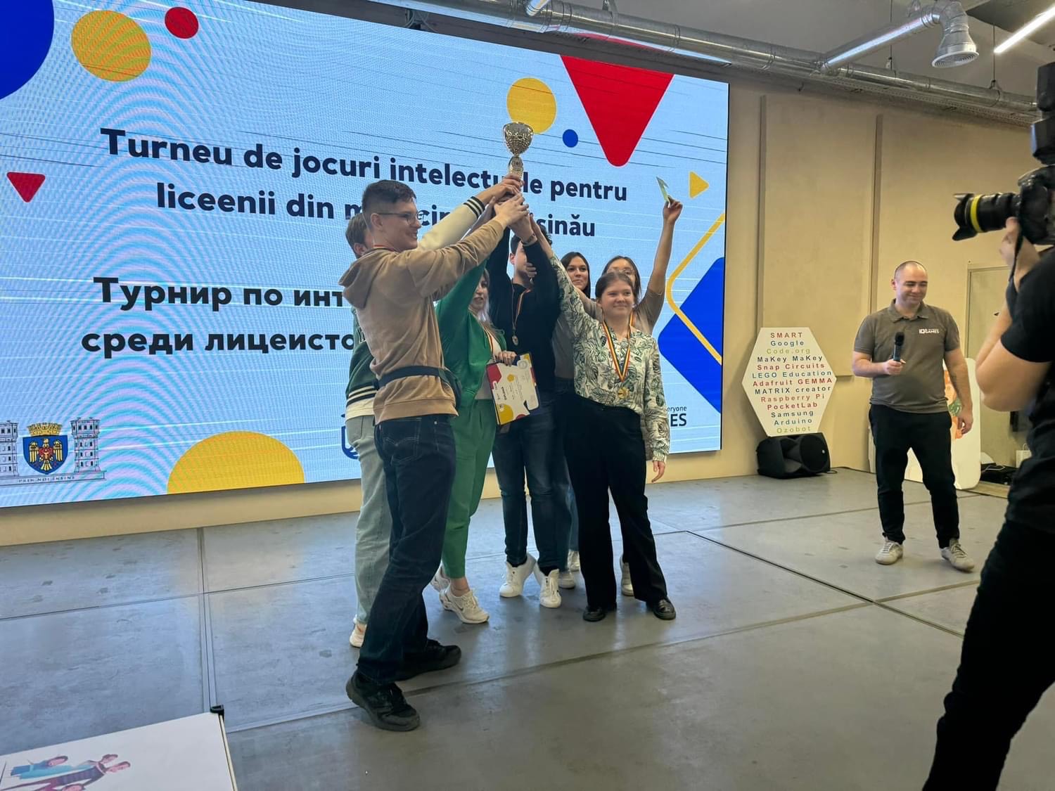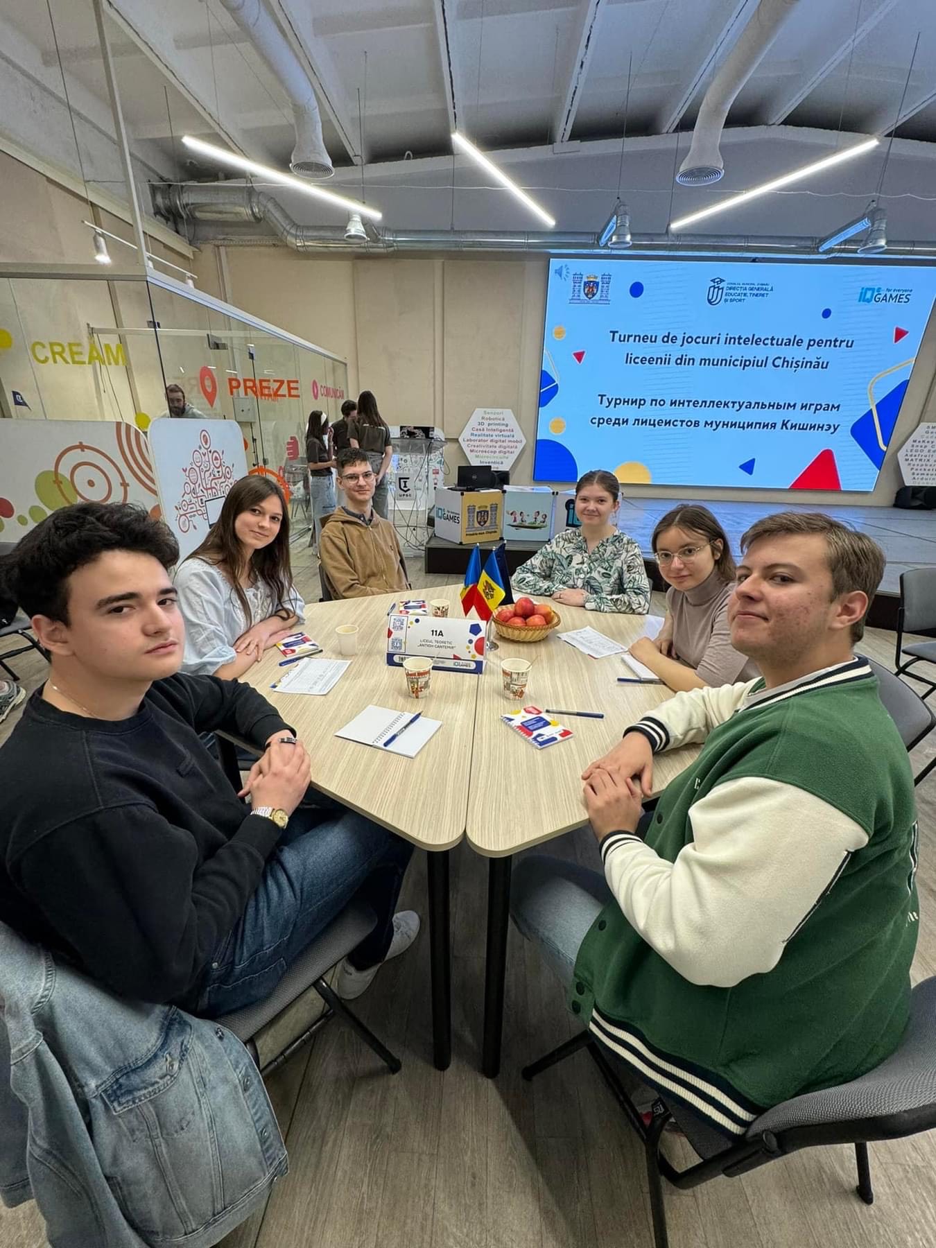 Сегодня состоялся финал Турнира по интеллектуальным играм среди лицеистов мун. Кишинэу. Команды 11А и 11Б классов в составе: Бордей Никита, Онила Александр, Варварюк Андрей, Долинская Афина, Погорлецки Аня, Лосева Саша, Фатеев Семен, Онофрейчук Ева, Гырбу Аманда, – достойно представили лицей в финале. Команда 11Б класса оказалась в числе финалистов, но не добрала финальных баллов. Команда 11А в тяжелой борьбе, набрав равное количество очков, в решающем раунде вырвала победу! И наши 11классники стали Чемпионами Мун.Кишинэу. Гордимся!!! Желаем новых вершин и побед! Ура!!! Данное мероприятие реализовано Ассоциацией интеллектуальных игр Республики Молдова в партнерстве с Главным управлением образования, молодежи и спорта Муниципального совета Кишинёва. Всем участникам вручили грамоты, призеры получили медали, кубок и денежные премии.