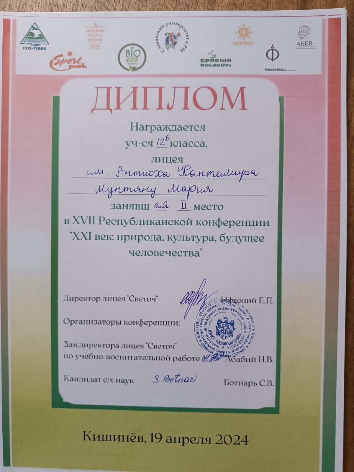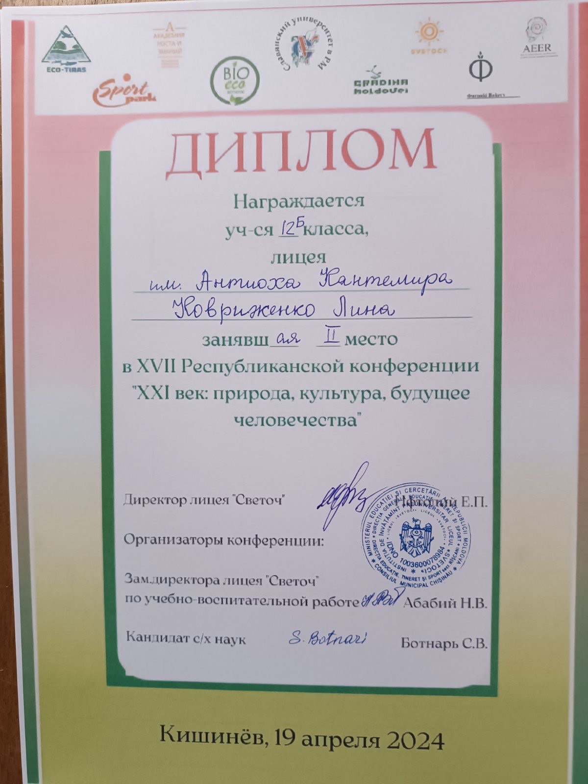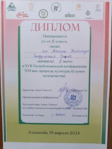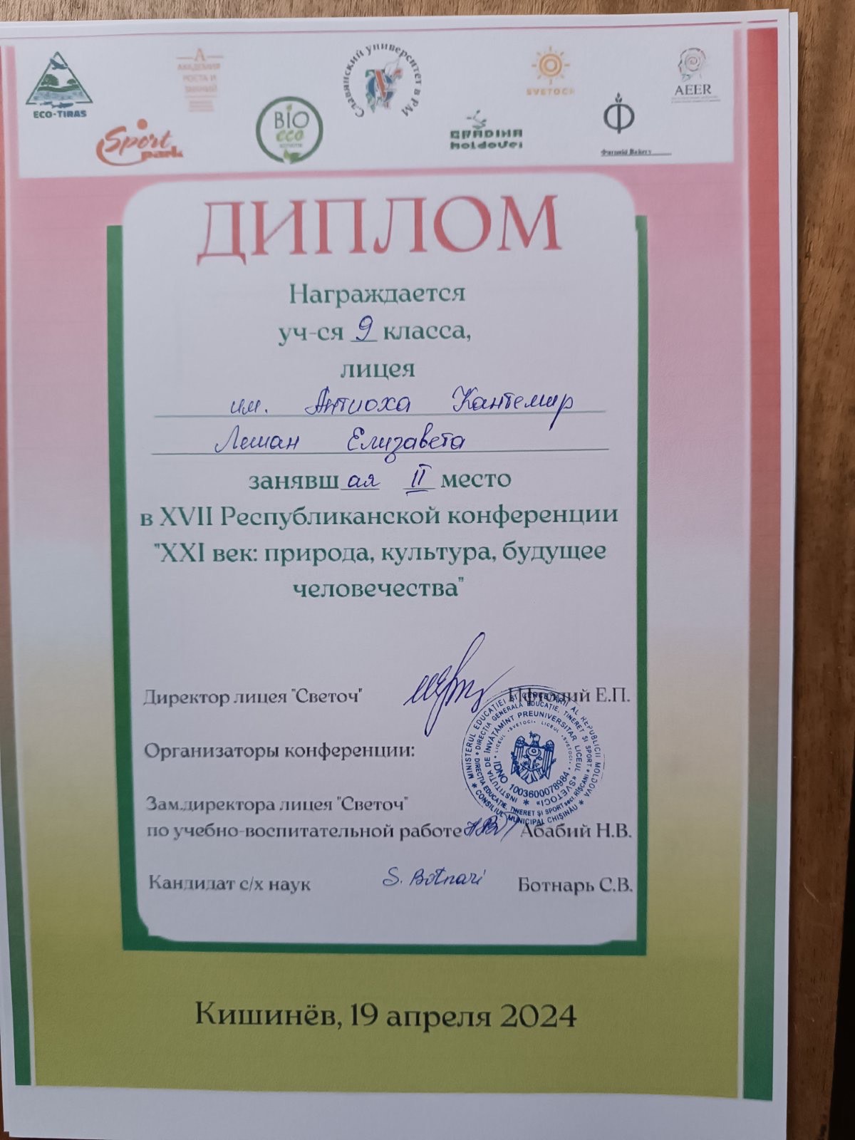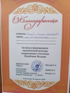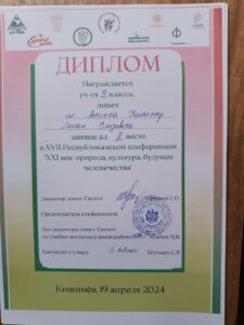 Наши дети на республиканской экологической конференции заняли вторые места. Это Сандульская Софья и Лешан Лиза – 9а, Мунтяну Мария и Ковриженко Лина -12б. Координатор: Князева Тамара Алексеевна.
